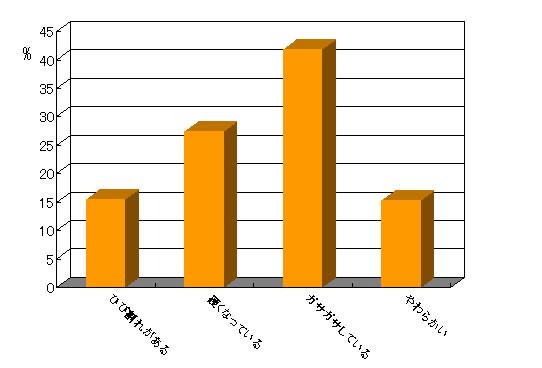 一方、現在の足裏の状態について聞いてみると、「ひび割れがある」と回答した人は、15.4%でした。しかし、足裏に特に問題がない「やわらかい」状態を保っている人は15.3%。その他は「硬くなっている」(27.4%)、「ガサガサしている」(41.9%)と何らかの症状があると回答しています。がさつきや皮膚の硬化は、ひび割れの原因にもつながります。つまり7割近くが「ひび割れ予備軍」なのです。