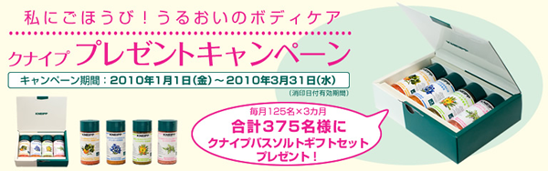 乾燥するヨーロッパでも保湿力に定評がある、クナイプのボディケア商品。この季節にぜひお試しいただきたく、「クナイプ バスソルト ギフトセット」(2009年11月発売)が当たるキャンペーンを実施します。