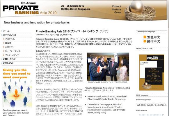 「Private Banking Asia 2010(プライベートバンキング・アジア)」の情報を提供するとともに、会議の参加のお申し込みを承っております。