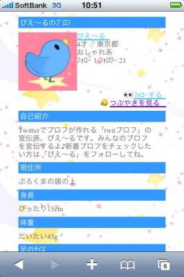 twitプロフは当初『プロフ』サイトのメインユーザーである中高生を利用者層として想定の上、構築を進めたため、従来の携帯プロフサイトと同様の機能・体裁をとっておりますが、この形態はあくまで初期リリース時のプロトタイプ的な位置付けと考えております。