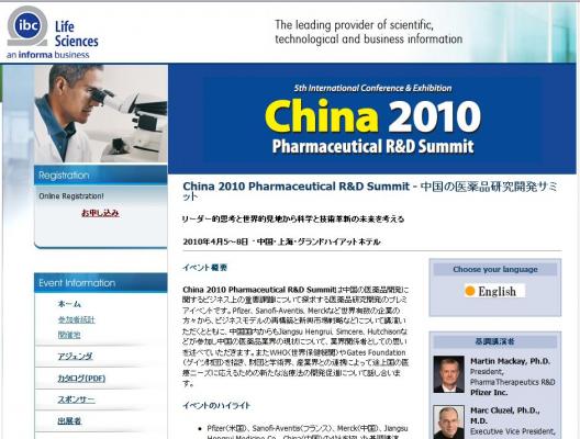 会議:「China 2010 Pharmaceutical R&D Summit (中国の医薬品研究開発サミット)」