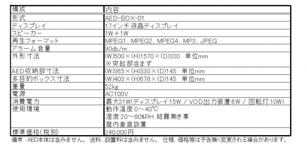 本製品はAED(注2)の収納ケースと動画再生ディスプレイを一体化しており、マルチメディアコンテンツの表現力を活かし電子広告を流す事で、広告主にはAED協賛によるイメージアップを、設置側には広告収入による導入費用の軽減などの効果が期待できます。また、AEDの利用ビデオを平時から再生することでより多くの市民にAEDの利用方法や、このケース内にAEDがある事を意識させ、認知度や救命率の向上に貢献します。