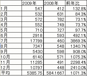 2009年の平均落札数は5385件となっており、2008年の平均落札数584件と比較して約10倍となっておりました。さらにマイケルジャクソンさんが急死した直後の7月については前年比38倍と落札数が急騰しておりました。