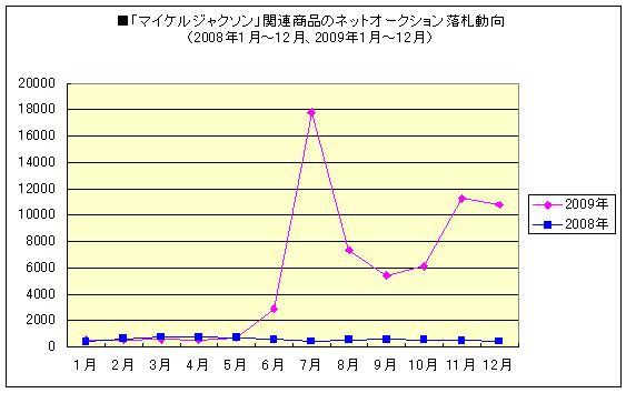 調査の結果、「マイケルジャクソン」関連商品に関して、2008年の主要ネットオークション市場合計が1月は「412件」、7月は「460件」、12月は「448件」の落札数となっておりましたが、2009年の同市場合計では1月は「547件」、6月は、「17,799件」、12月は「10,797件」の落札数となっておりました。