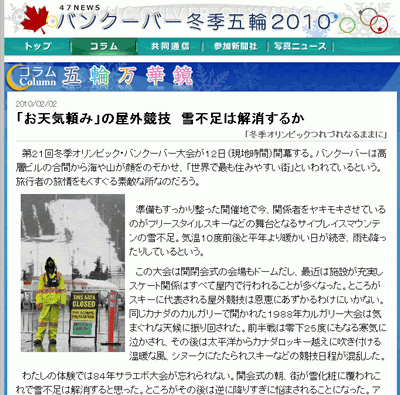 全国47都道府県52新聞社と共同通信の連合ニュースサイト 47NEWS(よんななニュース)は3日、バンクーバー冬季オリンピックの特集ページ(http://www.47news.jp/sports/olympics/vancouver/)を開設しました。