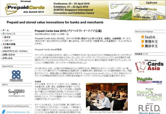 株式会社グローバル インフォメーションでは、皆様の利便性を図る為に、日本語、英語、韓国語、中国語で「Prepaid Cards Asia 2010 (プリペイドカード・アジア会議)」の情報を提供するとともに、会議の参加のお申し込みを承っております。