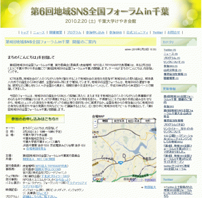 ブログやウェブサイトの企画・構築を手がける有限会社第四企画(東京都世田谷区・取締役社長 黒田正信)は、2月20日に千葉県の千葉大学けやき会館にて開催される【第6回地域SNS全国フォーラム】の公式サイトを制作・公開致しました。また、開催されるイベントに運営する地域SNS【下北沢ブロイラーSNS】を出展致します。