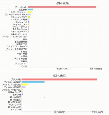 オークション分析ツール「オークデータ」によると、「福袋」関連商品は「ファッション」カテゴリの中の「ブランド別」「アパレル(女性用)」「アパレル(子供用)」のカテゴリでの落札が多数を占めておりました。