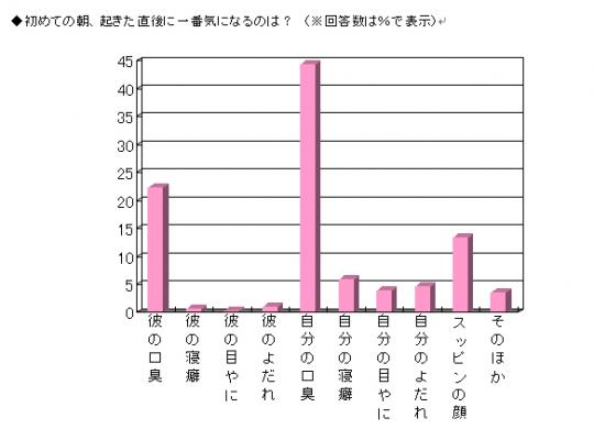 「初めての朝、起きた直後に一番気になることは何ですか?」と聞いてみると、「スッピンの顔」を大きく上回る回答数で、「自分の口臭」(44.3%)との回答が最も多く集まりました。また、次点として5人に1人が「彼の口臭」を選択しています。自分/相手を問わず、エチケットとして寝起きの口臭を一番に気にしている人が多いようです。