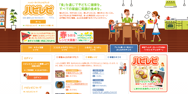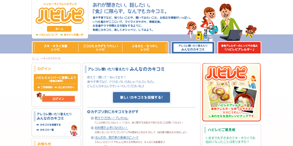 『ハピレピ』では、子そだてママのもつ食に関する疑問、質問、悩みのカキコミをみなさんの経験と思いやりで支えあうことを大切にしています。利用にあたっては、みんなの「ありがとう」を大切にしたサイトにしていきたいと思っています。