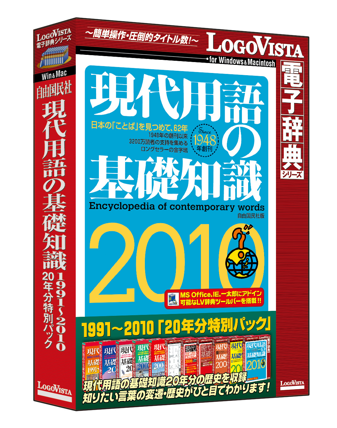 日本で唯一の新語辞典『現代用語の基礎知識』の最新2010年版のデータに加え、過去20年分のデータを一つにまとめたロゴヴィスタだけのお得なパックです。「バブル崩壊」から「政権交代」、「草食系男子」まで、注目の事象、流行現象を20年分丸ごと収録しています。20年分の全データから一度に検索、年度ごとの記述の変遷をカラーでわかりやすく表示。新語の登場時期や意味づけの変遷などを比較でき、“いま”だけでなく時代の“うつりかわり”もわかります。