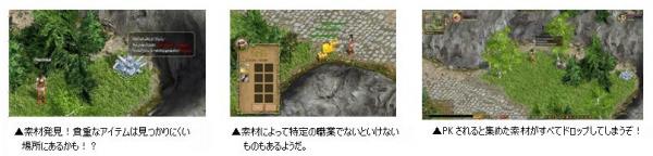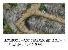 また、一方で、「キャラバンウェイ」は、他のプレイヤーにいつ襲われるか分からないPK(Player Killer/Killing)地域であり、非常に危険な地域となります。せっかく集めた材料をすべて失わないためにも、常に他のプレイヤーを用心する必要があります。