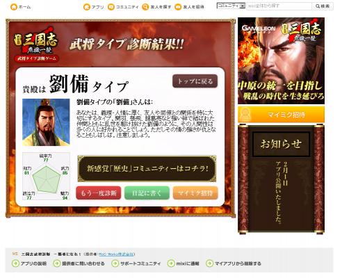 ■mixiアプリ「三国志武将診断 -覇者になれ!」