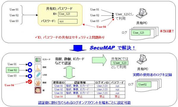 SecuMAPは、ID やパスワードによるWindowsログオン、WEBアプリケーション利用前の本人認証を、IC カード(FeliCa)および生体認証(指紋、静脈)などの各種認証方法に置き換えることで、セキュリティと利便性の向上を実現するシステムです。