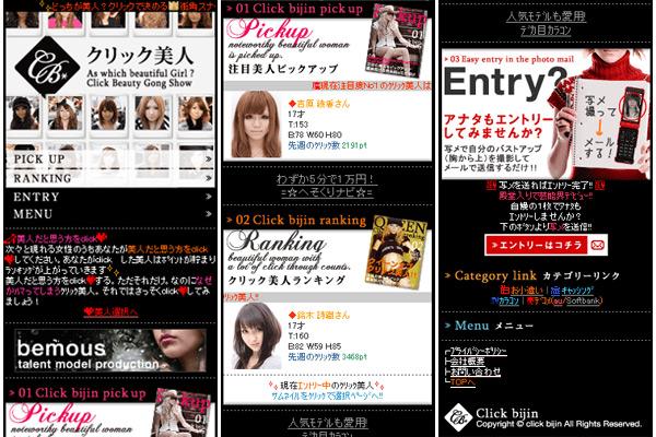 ランダムで表示される2名の女性の内、美人だと思う方をクリックしてポイントを付け、それをランキング化していくというシンプルながらもついついハマってしまう携帯専用無料コンテンツ。