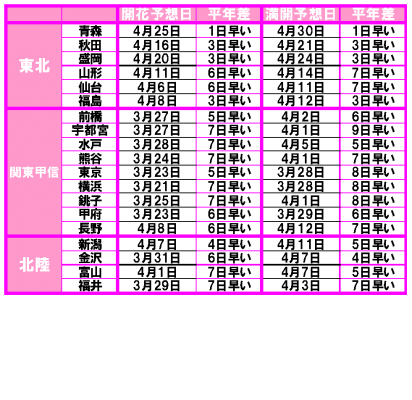 2月下旬の記録的な暖かさと3月の高温予想の影響で、開花は東北南部から九州にかけて平年より一週間前後早い予想です。トップは高知の3月16日で、春分の日を含む三連休のあたりから東西日本は開花ラッシュに。4月上旬には桜前線がみちのく入りする見込みです。お花見が一番楽しめる満開期間は関東から九州で3月終わりから4月二週目の半ば頃まで。入学式は満開の桜で迎えられる所も多いものの、比較的早く満開を迎える東京は、少し散り始めているかもしれません。青森の見ごろは大型連休になりそうですよ。