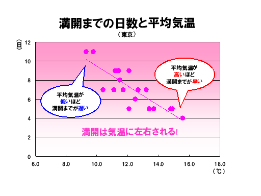 グラフは、東京で開花日が3月21日だった2006年と2009年の開花から満開までの日平均気温の推移を表したものです。開花してからの日平均気温が高かった2006年は、満開までに7日しかかからなかった一方、開花してから、寒の戻りがあった2009年は、満開までに12日も要したことがわかります。開花から満開に至るまでは、日平均気温に大きく左右され、LBWでは、ここに着目して、満開(見頃)となる時期を適確に導き出すことで、見頃を逃さず、お花見計画により役立つ全く新しいさくら情報を提供いたします。お花見幹事さん必見です!