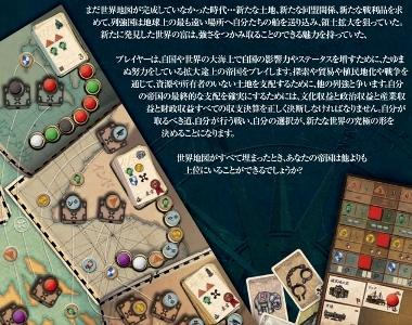 プレイヤーは、自国や世界の大海上で自国の影響力やステータスを増すために、たゆまぬ努力をしている拡大途上の帝国をプレイします。探索や貿易や植民地化や戦争を通じて、資源や所有者のいない土地を支配するために、他の列強と争います。自分の帝国の最終的な支配を確実にするためには、文化収益と政治収益と産業収益と財政収益すべての収支決算を正しく決断しなければなりません。自分が取るべき道、自分が行う戦い、自分の選択が、新たな世界の究極の形を決めることになります。