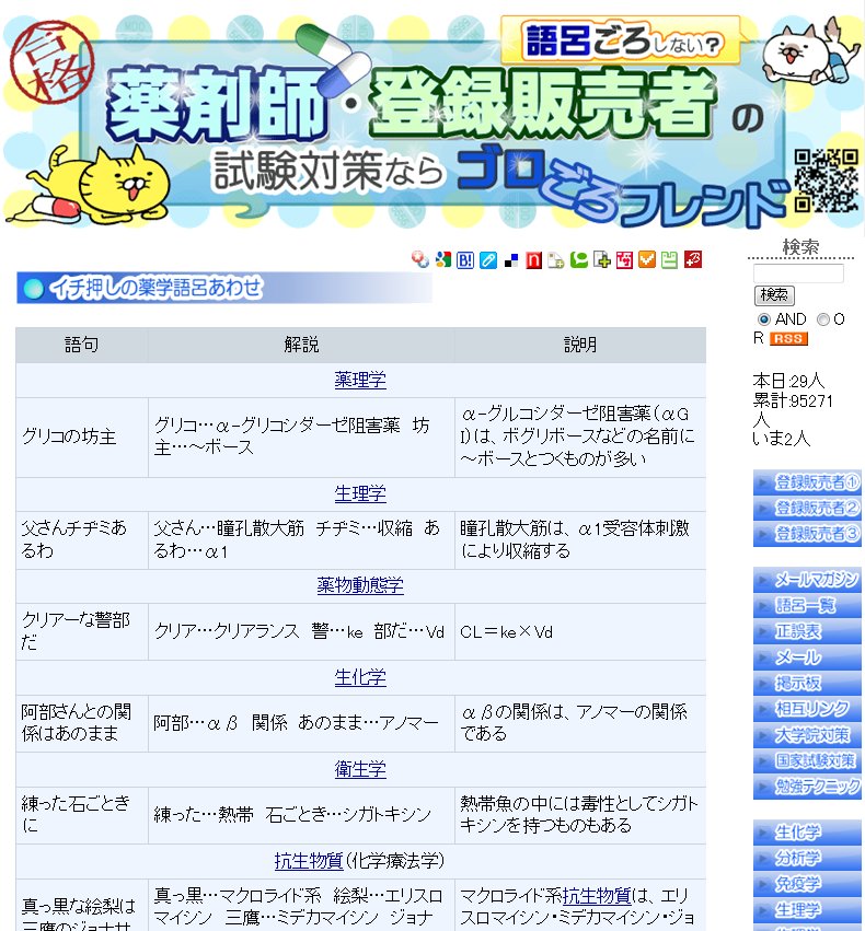 「ゴロごろフレンド」には薬剤師国家試験のために作られた語呂あわせが251個あり、薬学の語呂合わせとしては最大級の掲載量となっています。薬剤師国家試験の出題範囲は、登録販売者試験の出題範囲と重複するため、これから登録販売者を目指す受験生だけでなく、薬剤師国家試験を目指す薬学生にとっても、有用性がさらに高まりました。