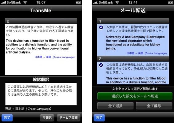 TransMeには、 翻訳履歴とメール転送機能が搭載されています。例えば、日本語を外国語に翻訳してメール送信したい場合は、メール文をランダムに日本語入力して外国語に翻訳。後で、 履歴からメール文として使いたい文章を選択。 「選択した訳文をメールへ転送」で、iPhone/iPod Touchのメールアプリに翻訳文を転送します。翻訳文を保管しておきたい場合の記録機能としてもご利用いただけます。