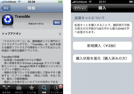 TransMeは、無料版で全機能がご利用いただけます。 無料版は、一度に翻訳できる原文の長さが128文字まで、という制限以外は有料版と同じです。 TransMeを気に入っていただければ、 アプリ内で「拡張キット/230円」をお求めいただくことで、 翻訳対象原文の長さが2,048文字に拡張。外国語で届いたメール文や、 ネットに書かれた外国語の文章も、 文字量を気にせずに一気に翻訳することができます。(本製品は、利用期間の制限はありません。)