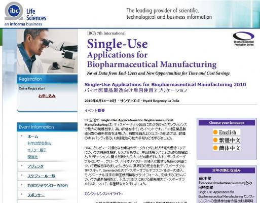 「Single-Use Applications for Biopharmaceutical Manufacturing 2010 (バイオ医薬品製造向け単回使用アプリケーション)」の情報を提供するとともに、会議の参加のお申し込みを承っております。