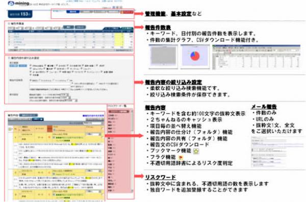 「e-マイニング」はインターネット上の膨大な情報から、通常の検索では見落としがちな自社関連情報を効率的に発見し、特に「情報漏洩」「風評被害」「誹謗中傷」「荒らし・炎上」「クレーム・苦情」「誤記載」などのリスク情報をチェックするリスクモニタリングサービスです。企業の的確な情報把握は、インターネット利用者とのコミュニケーション円滑化・活性化につながります。2000年1月から開始している「e-マイニング」は、上場企業を中心に累計で約700社以上にご利用いただいています。