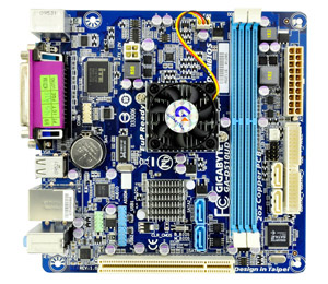 GA-D510UDは、Intel GMA 3150グラフィックス内蔵のCPU、Intel Atom D510を搭載したMini-ITX規格のマザーボードです。Intel Atom D510は従来、チップセットに内蔵されていたグラフィックス機能やメモリコントローラーをCPUの演算コアに統合することで2チップ構成となり、従来の一般的な3チップ構成(CPU + 945GC + ICH7)と比較して更なる省電力化を実現しました。