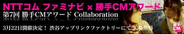 第7回勝手CMアワードは3月22日(月・振替休日)に東京都渋谷区のアップリンク・ファクトリーで開催されます。ケータイ放送局「1mini.TV」(http://1mini.tv/)でも公開ならびに投票を行い、人気ナンバーワンに輝いたグランプリにはトロフィーと賞金3万円が贈られます。