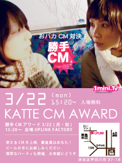 第7回勝手CMアワードは3月22日(月・振替休日)に東京都渋谷区のアップリンク・ファクトリーで開催されます。ケータイ放送局「1mini.TV」(http://1mini.tv/)でも公開ならびに投票を行い、人気ナンバーワンに輝いたグランプリにはトロフィーと賞金3万円が贈られます。