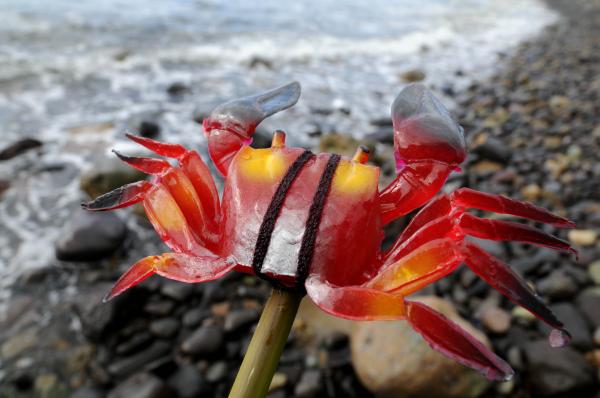 写真上:水中写真家の中村征夫さん/写真下:秋田県男鹿の「タコだまし漁」で使われているカニの疑似餌。竹竿の先に結わえ付けて、海の中で震わせると、タコが本物のカニと間違えて抱きついてくる。文字通り、タコをだまして獲る「タコだまし漁」は、昔から誰でもできる浅瀬のおかず漁として、この地域の暮らしに根付いている。