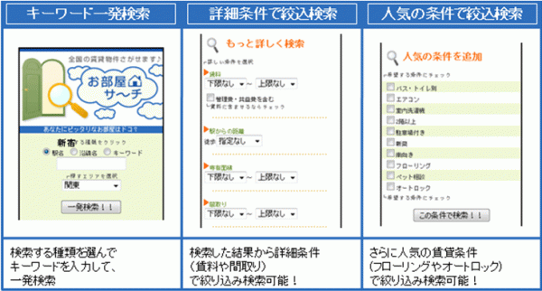 また、閲覧ユーザーに対しての機能面も充実しており、物件検索方法は駅名、沿線名、間取り、家賃、オートロック有無やキーワードの自由入力など幅広いユーザーニーズに対応出来るように豊富な検索方法を採用しております。