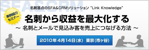 Link Knowledge(リンクナレッジ)は300社(*)以上の企業に導入されている、名刺を基点とした、最新のCRM&SFAソ リューションです。本セミナーでは、名刺を活用して収益アップを実現した事例を中心に、Link Knowledge(リンクナレッジ)をメールマーケティングや"営業の効率化"、"顧客接点の強化"に活用する方法に ついて、豊富な事例を交えてご紹介させていただきます。