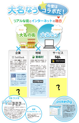 株式会社フライトシステムコンサルティング(東京都渋谷区・代表取締役:片山圭一朗)、頓智ドット株式会社(東京都新宿区・代表取締役CEO:井口尊仁)、株式会社リアル・フリート(東京都渋谷区・代表取締役社長:熊本浩志)、東通インテレクト株式会社(東京都渋谷区・代表取締役:山見真弘)は、3月19日(金)から同月22日(月)に渡って福岡市中央区大名で行われるTwitterとリアルメディア連動企画「大名なう」において、動画とAR(拡張現実)のコラボレーションを共同で展開することになりました