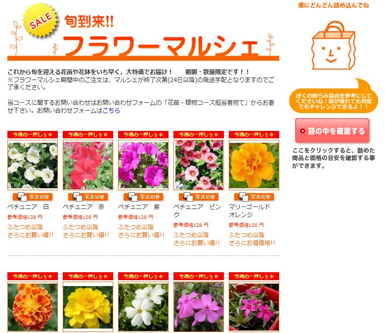 自宅に居ながらにして、生の花苗や花鉢などを一つの袋に自由に詰められ購入できます。
