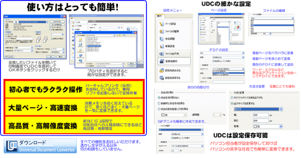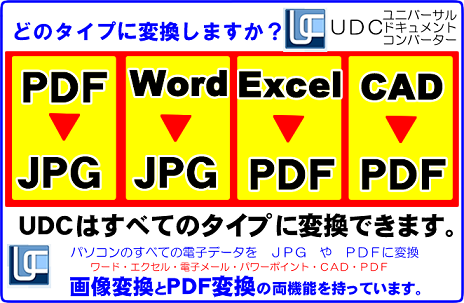 有限会社ビグパソネットでは、日本初登場となるユニバーサルドキュメントコンバータ(以下UDC)を3月から販売しています。電子データをPDF変換するのは当たり前、UDCは、さらにPDFや電子データをJPGなどの画像に変換にできる優れものです。これ1本あればどんな形式のデータにも変換する万能変換ソフトです。UDCは今編集中の電子データを、、印刷ボタンをクリックするだけですばやくきれいに画像やPDFに変換する仮想プリンタソフトです。初心者でも簡単に操作できます。わざわざ変換専用ソフトを起動して変換する手間が一切かかりません。UDCは、すでにカナダ・ドイツ・シンガポールなどで販売されており、シーメンスという世界最大電子機器メーカーやロイターなど世界の一流会社がUDCを採用しています(http://www.print-driver.com/testimonials/)。