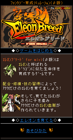 『エレオンブリード for mixi』は、過去にモブキャストが有料版ケータイアプリとして100万配信を達成した人気ゲーム『エレオンブリード』をソーシャルアプリ向けに新たに企画したものです。ドラゴンの血を引く生命体「エレオン」を育てる、育成シミュレーション型ソーシャルゲームとなっています。