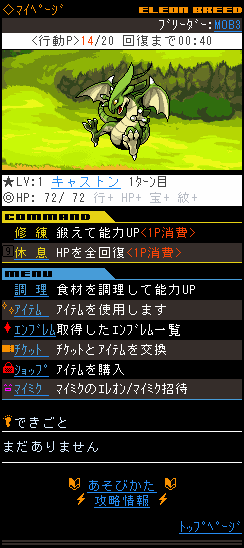 プレイヤーはエレオンを育てる「ブリーダー」として、修練場でのトレーニングや、修練中に入手した食材アイテムを使って調理を行い、より強いエレオンの育成を目指します。育成対象となるエレオンは、2体の親エレオンを交配することで誕生します。この時、マイミクのエレオンを親エレオンとして新たなエレオンを生み出すことも出来ます。