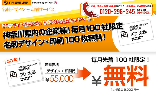 さて、弊社では2010年2月末日を持ちまして、制作・運営に携わらせていただいたサイトが500件に達しました。この度、お客様への感謝の気持ちを込めまして、神奈川県内・横浜市内の企業様に、無料で名刺を制作するキャンペーンを実施することにいたしました。