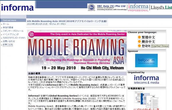 株式会社グローバル インフォメーションでは、皆様の利便性を図る為に、日本語、韓国語、中国語で「Mobile Roaming Asia 2010(2010年アジアモバイルローミング会議)」の情報を提供するとともに、会議の参加のお申し込みを承っております。