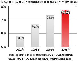近年、成果主義人事制度への移行、ITによる業務内容の変化、雇用不安感や業務量の増加など、急激な労働環境の変化によって職場におけるメンタル不調者は増加しており、77.2%の上場企業が心の病で1ヶ月以上休職中の従業員を抱えております。(財団法人日本生産性本部「産業人メンタルヘルス白書」2009年版調べ)