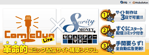 ComicDuoLite セキュリティーマネープラスは、携帯一般サイト向け電子書籍配信サイト運営に必要な機能が全て揃っており、サイト運営者様の負担を極限まで抑えた他に類をみないCMSサービスです。今回、GICが展開する『セキュリティマネー』を初期導入時より標準搭載し、携帯一般サイト向け電子書籍配信サイト運営に必要な決済手段をプラスすることによって、ユーザー様にも事業者様にもメリットのあるサービスを実現いたしました。