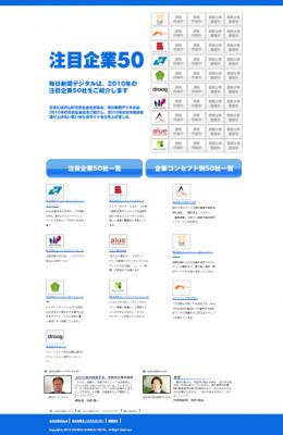 「注目企業50」は、厳しい経済情勢の中、積極的にチャレンジし可能性を見出そうとしている企業を応援しようと、「週刊エコノミスト」(毎日新聞社)の内野雅一編集長をチーフアドバイザーに迎え、IT、人材育成、コンサルティング、語学関連、福祉、環境、不動産、建築などさまざまな業種から50社を選び、紹介するサイトです。