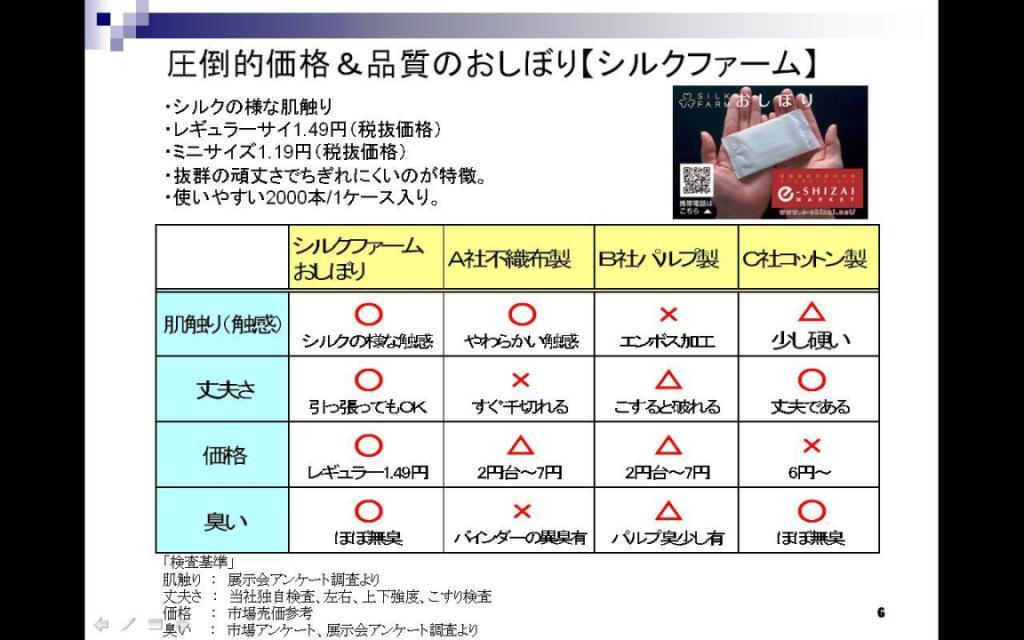 圧倒的低価格と高品質を誇る「シルクファーム」は、シルクのような肌触りでちぎれにくい欧州メーカーの不織布素材を活用し、市場流通の最安値から更に3割程安い、レギュラーサイズ1本1.49円(税抜)という設定をし、1ケース2000本の企画で中小店舗様にもお求め易いロットといたしました。