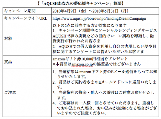 新年度を迎えて将来の夢や目標を掲げて新生活をスタートされている方の多いこの時期、ソーシャルレンディングサービス「AQUSH(アクシュ URL:http://www.aqush.jp/)」では、夢の実現や目標達成のためにAQUSHローンをご利用されたお客様のうち、夢や目標に関するアンケートにお答えいただいた方の中から抽選で10名様にamazonギフト券(10,000円相当)をプレゼントいたします。