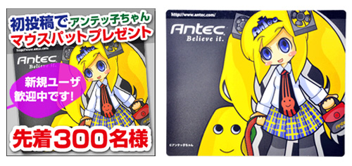 AntecMapへ初登録&初投稿を頂くと、先着300名様に「アンテッ子ちゃんのマウスパッド」をもれなくプレゼントいたします!投稿テーマに制限はありません。自作PCに関することなら何でもOKです。