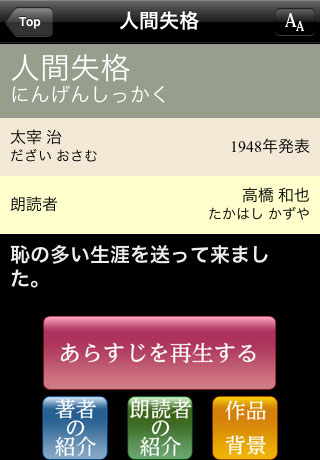 iPhoneならではのマルチタッチによる拡大やセンサーによる画面の回転、縦書き/横書き表示にも対応。また、朗読の途中からの再生もでき、時間のある時に少しずつ読み進められます。