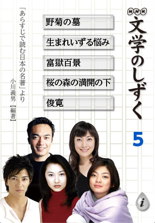 『NHK 文学のしずく 5』には、『野菊の墓(伊藤左千夫)』、『生まれいづる悩み(有島武郎)』、『富獄百景(太宰治)』、『桜の森の満開の下(坂口安吾)』、『俊寛(菊池寛)』の5作品を収録しています。