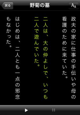 iPhoneならではのマルチタッチによる拡大やセンサーによる画面の回転、縦書き/横書き表示にも対応。また、朗読の途中からの再生もでき、時間のある時に少しずつ読み進められます。