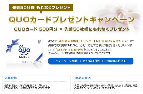 内容:ホームページの専用フォームから資料請求(無料)・アンケート回答をくださった先着50社にもれなく、お礼として500円分のQUOカードを添えて資料を送付します。